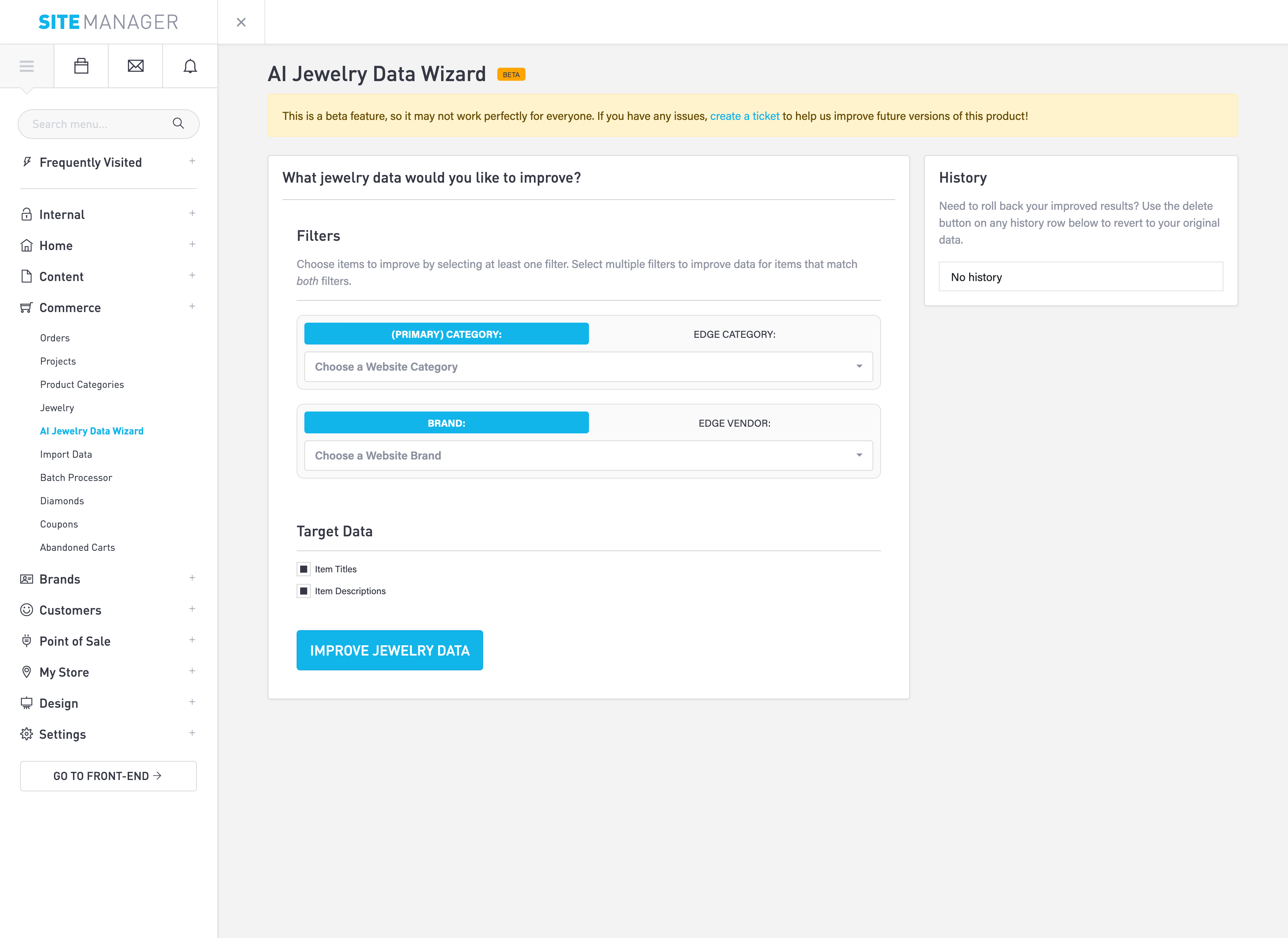 To start, open SiteManager > Commerce > AI Jewelry Data Wizard.