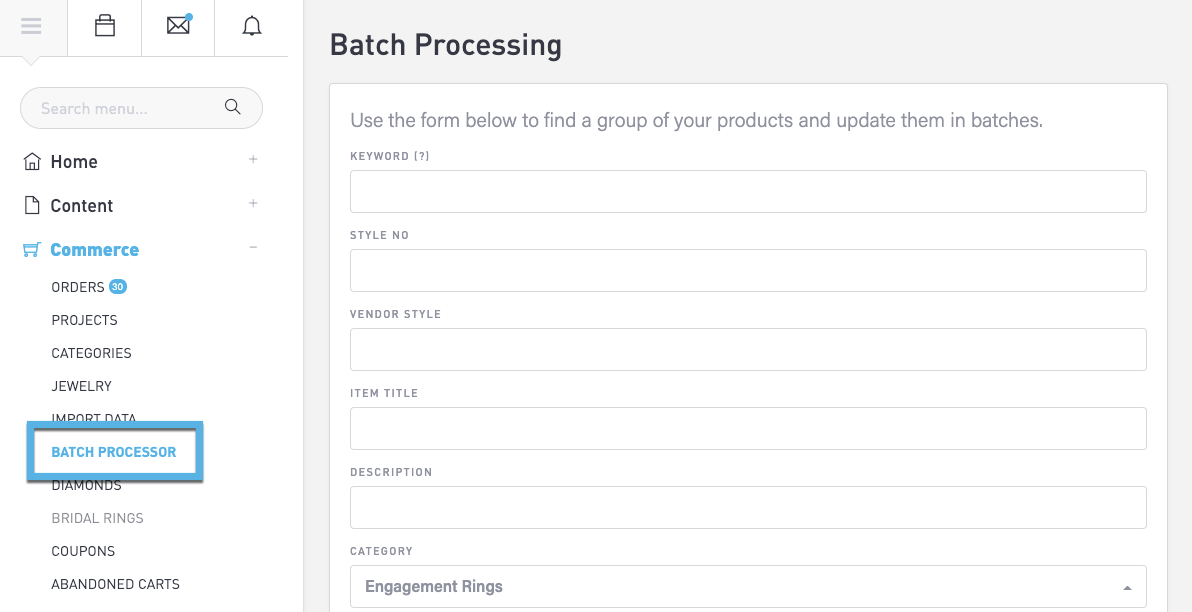 To access this feature, click Commerce > Batch Processor in the main menu.