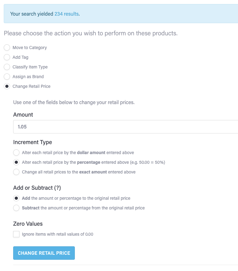 Click to choose the Change Retail Price operation, then enter .05 for the Amount. For Increment Type, choose Alter each retail prices by the percentage entered above.