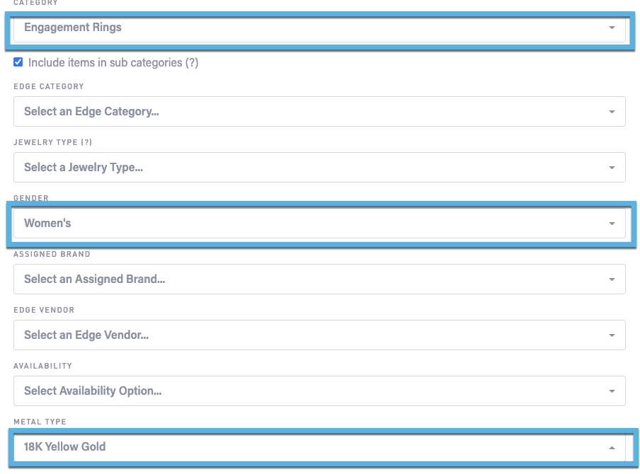Let’s say, for example, that you want to increase the price of all 18K yellow gold women’s engagement rings by 5%.