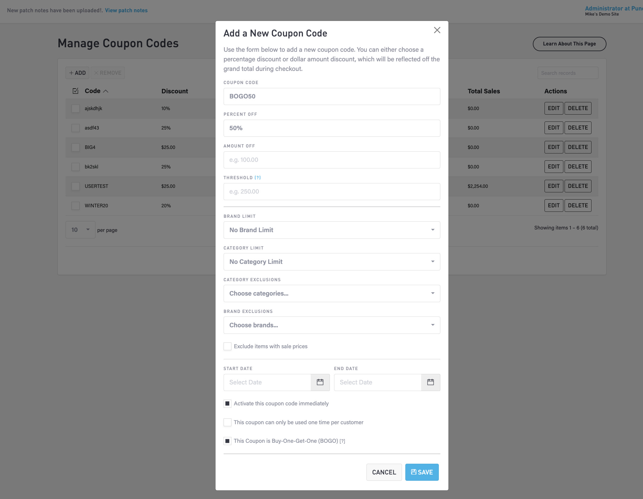 There are a variety of options for seeing up your coupon, including exclusions for limiting your coupons eligibility, or an “Amount Off” option, instead of a % off.