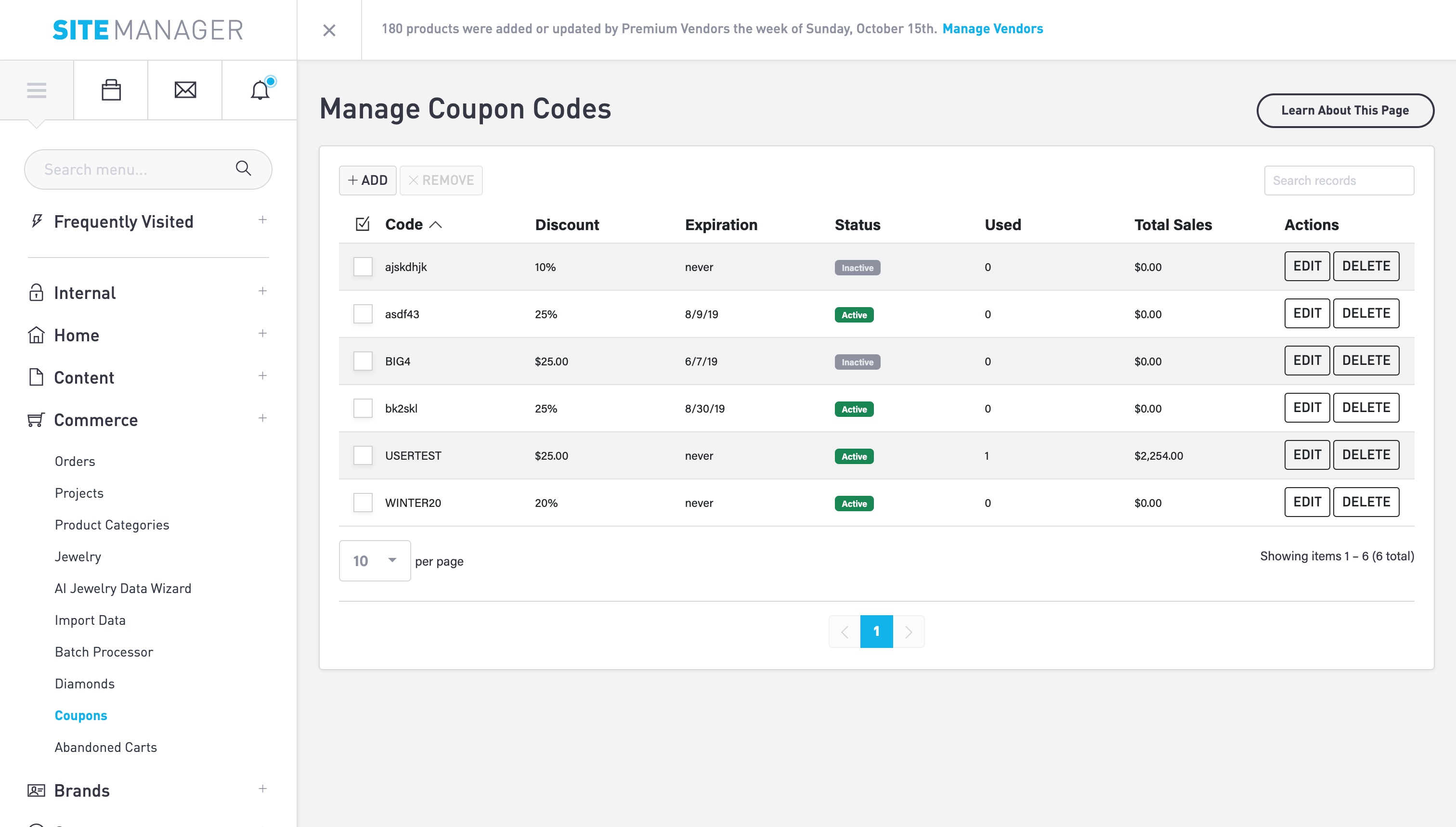 Begin by logging into SiteManager > Commerce > Coupons. Select the button in the upper left that reads “+ADD”.