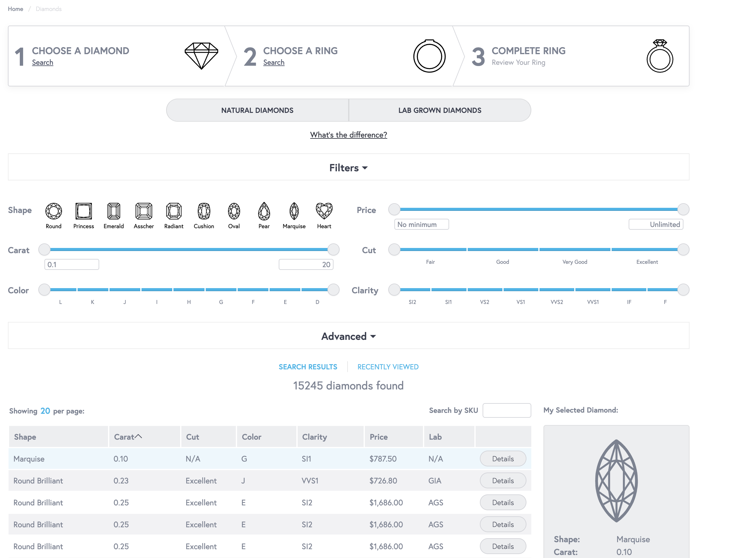 After a shopper selects a ring setting, they’ll be prompt to choose a Diamond.