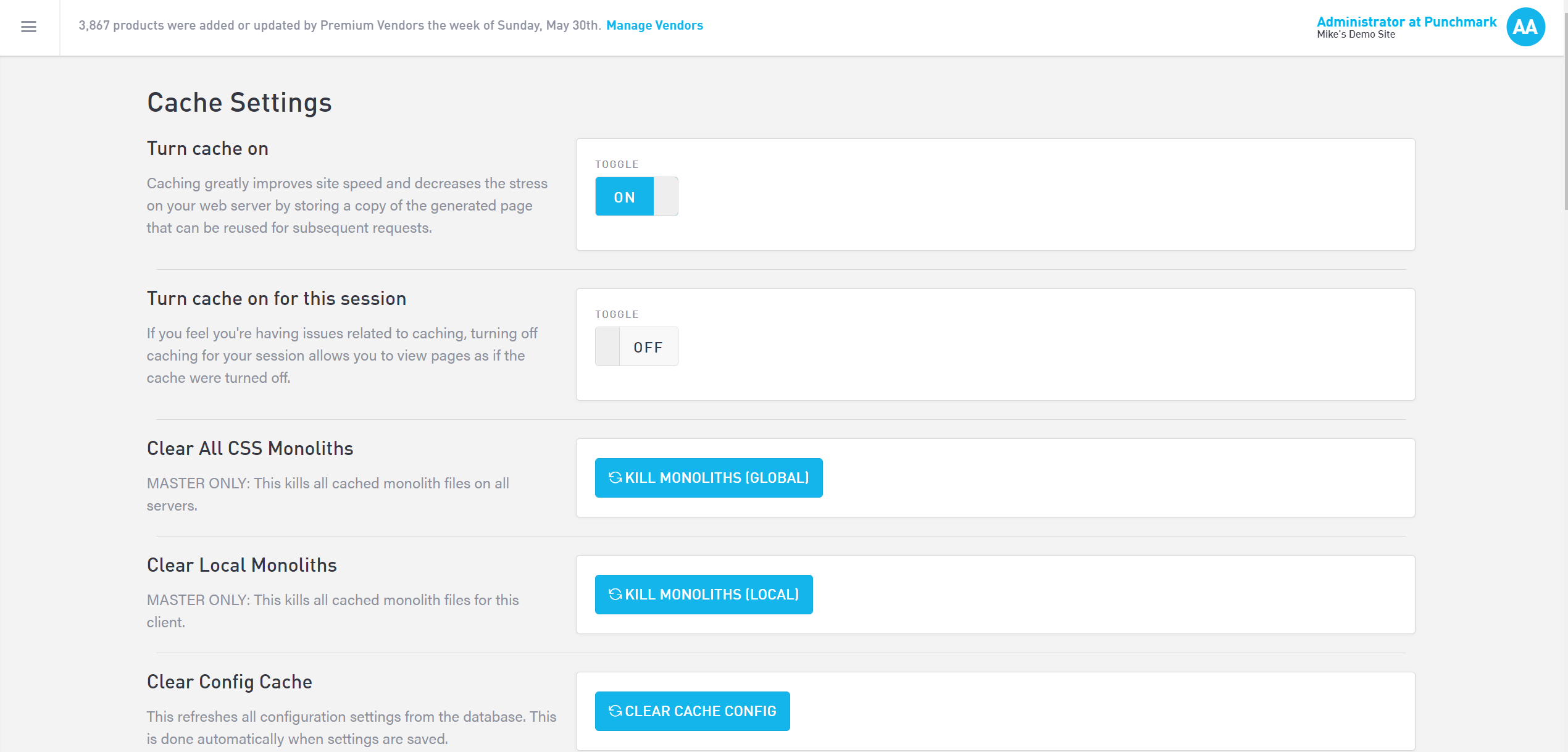 Clear Config Cache - This refreshes all configuration settings and is done automatically when settings are saved. An example of a configuration setting might be updating Google Analytics IDs.