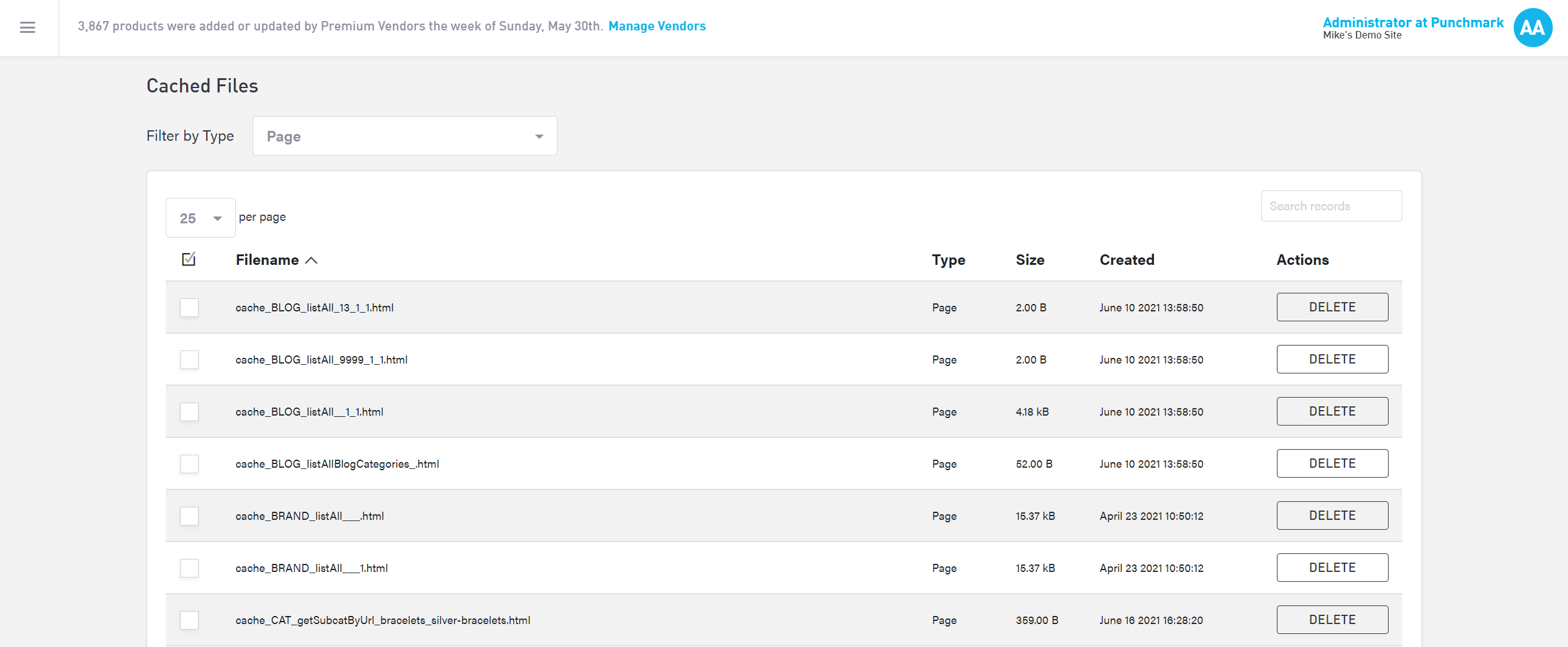 You can delete certain page caches manually. Use the Cached Files section to search for the cache you wish to delete and select the “Delete” button to the right of the file name. You can also use the “Filter” dropdown at the top to narrow down the files by type. If you do not see the Delete button, you are not able to delete this cache, as it would cause problems for your site.