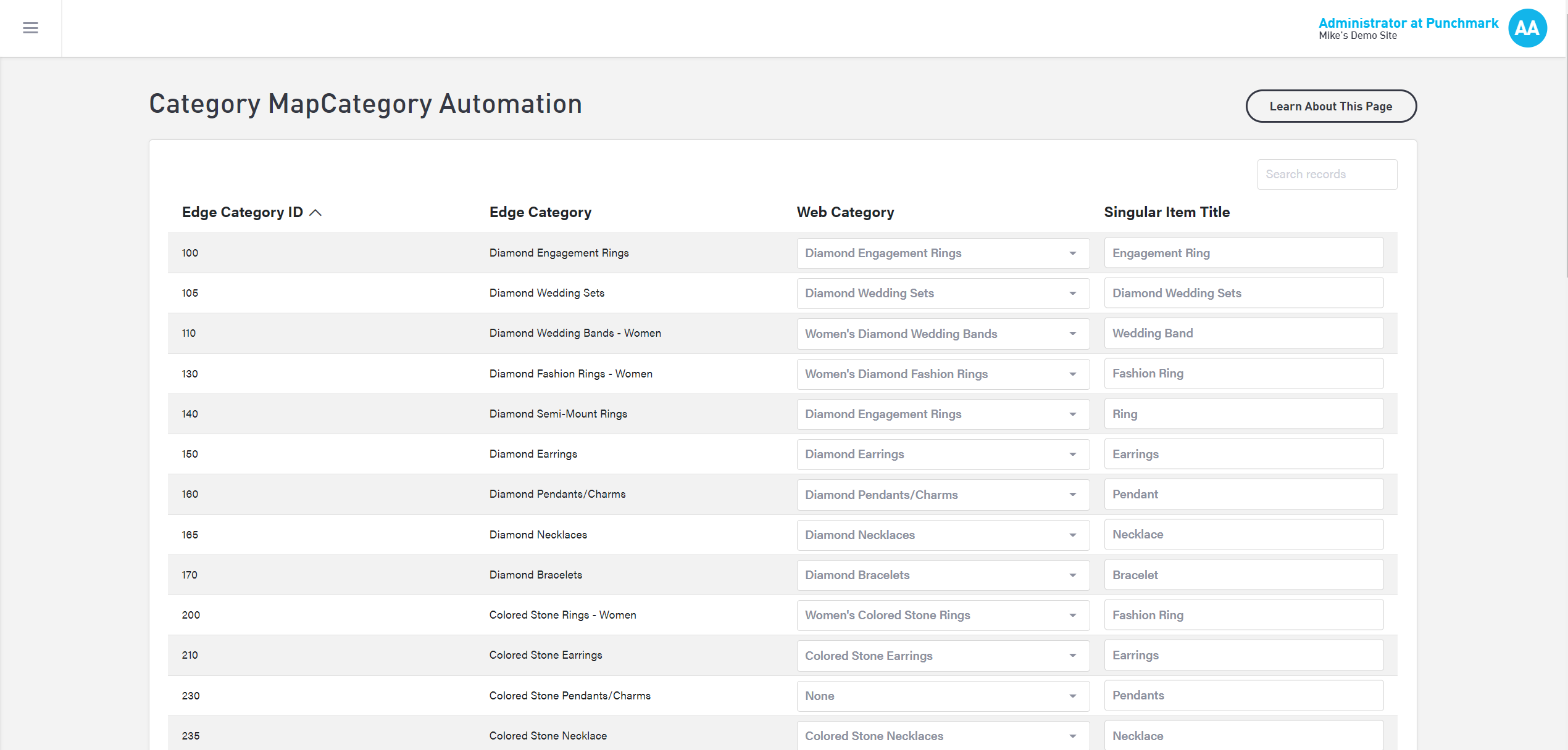 Once you import your data from The Edge, you will be able to see the Edge Categories populated in the Category Mapping section. For each Edge Category, use the dropdown menu under Web Category to choose which category of your website the Edge category should map to. Enter a Singular Item Title to specify what one of those items should be called (i.e. within the category “Diamond Engagement Rings” you may choose to call an individual item “engagement ring” or “diamond engagement ring” or simply “ring” depending on your preferences).