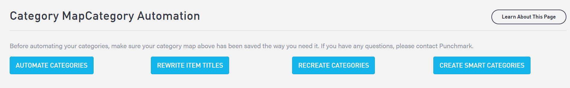 Create Smart Categories: Smart Categories are usually only used before your website has any categories. It automatically creates categories for your website based on what exists in your Edge account. Proceed with caution and consult a Punchmark team member if using this option, as it could result in wiping your current categories.