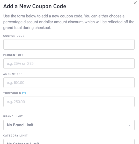 Click the Add button to add a new coupon code. In the popup window, either choose a percentage discount or dollar-amount discount. The discount will be deducted from the grand total during checkout. Click the Save button to save the coupon code.