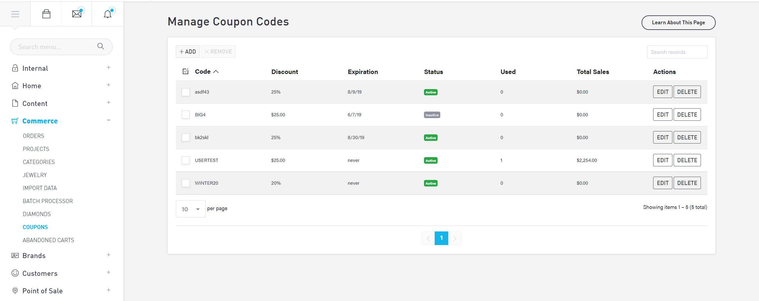 You can manage coupon codes for your website. To access this feature, click Commerce > Coupons in the main menu.