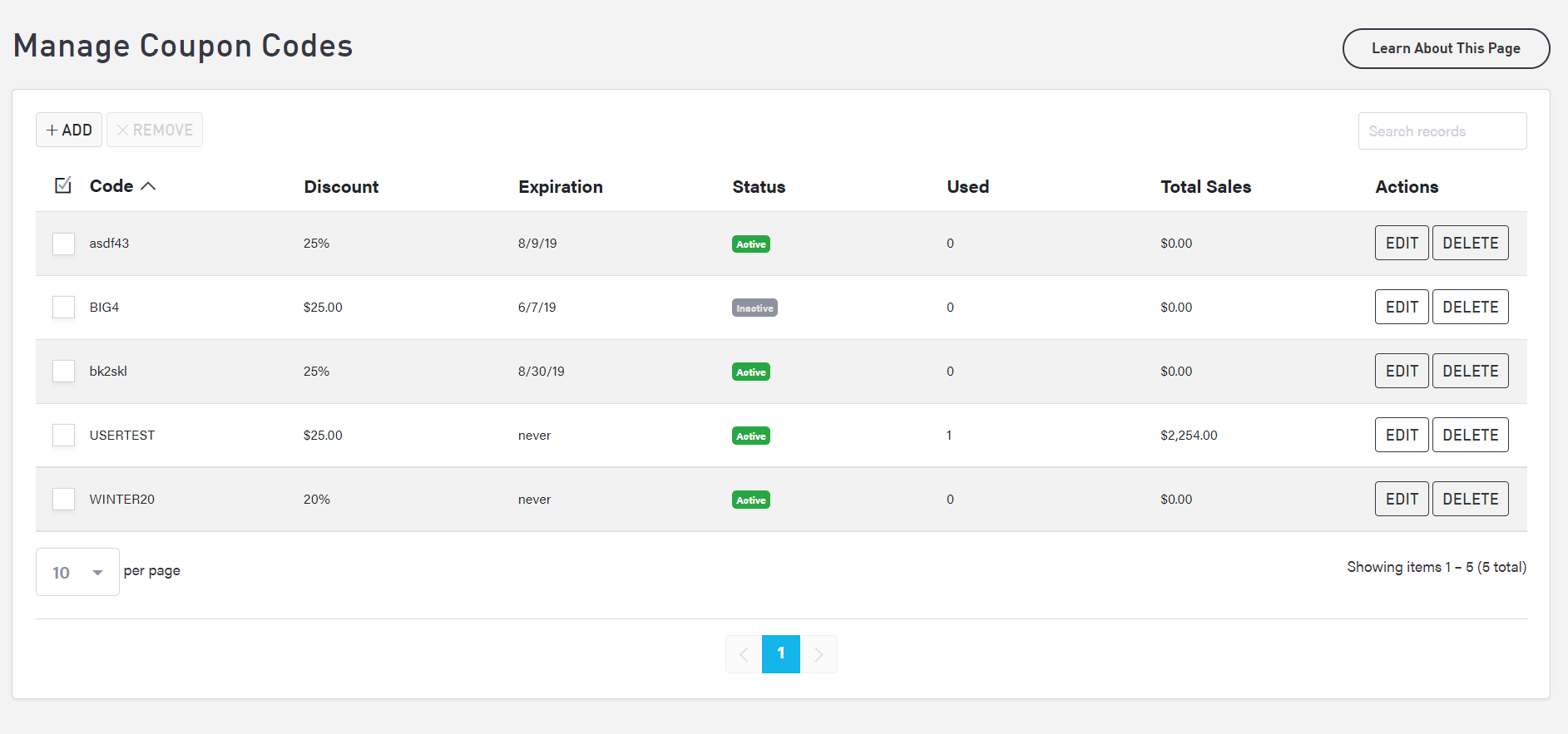 From your coupon code page, you can see the details of each coupon code, including the coupon’s discount amount, expiration date, and active/inactive status. You can also see how many times a given coupon has been used and the total sales resulting from a specific coupon code. The total sales column is calculated based on transaction totals.