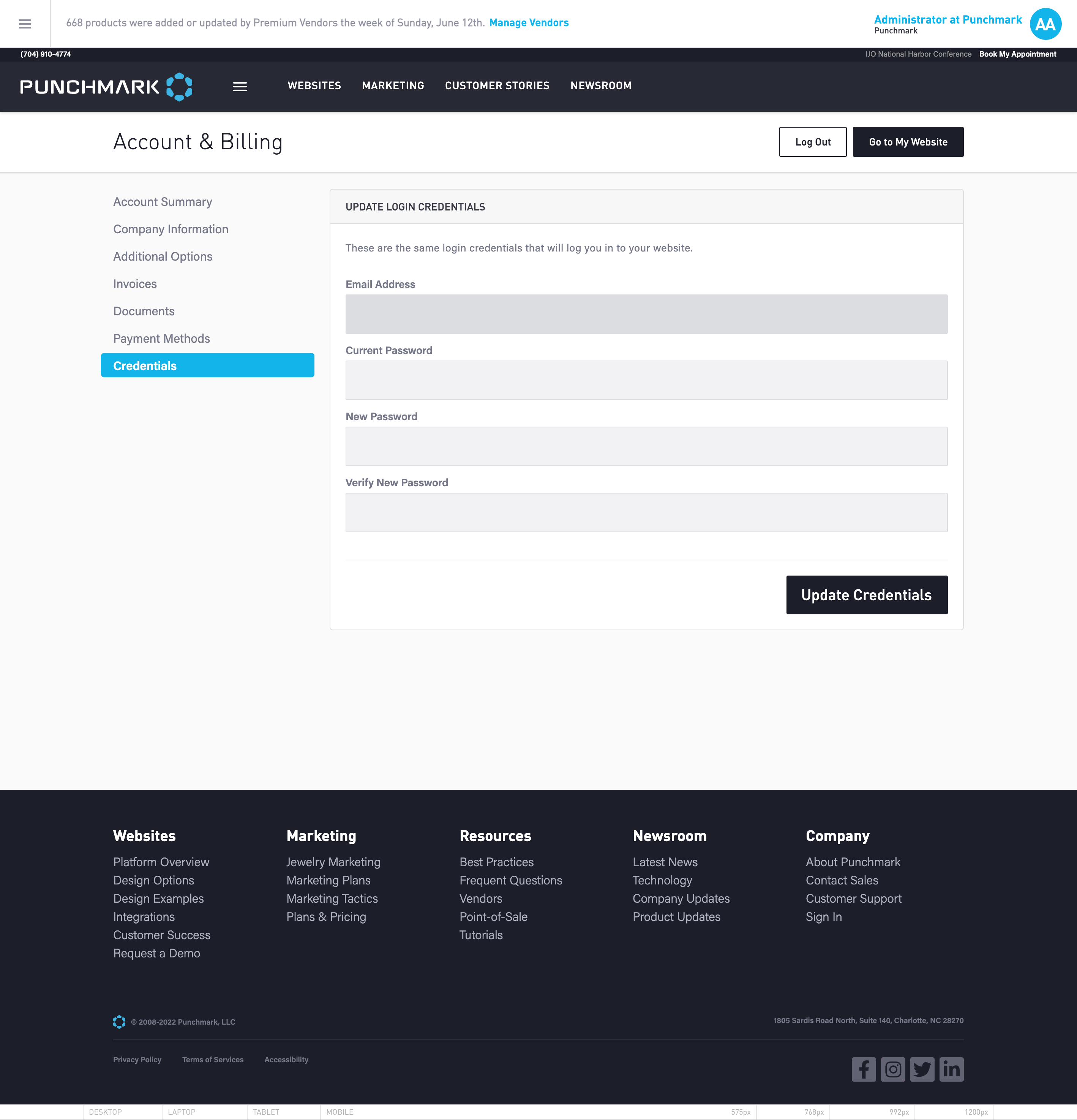 In the Credentials page you will be able to update your login credentials for you website which will also be used to login to the My Account Portal.