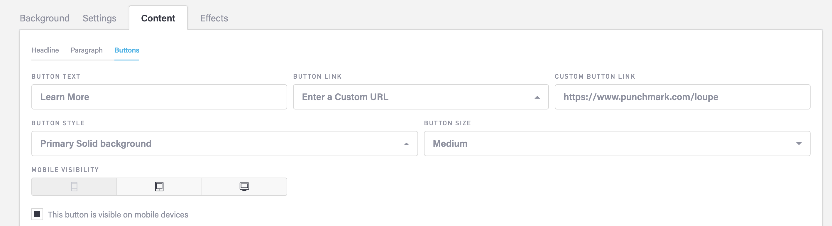 To add a button to your slide, in the Content tab, select the Buttons sub-tab and add your call to action to the Button Text, and either link your website’s page, or a custom URL that the button will link to. URLs that are not on your website or begin with https://, will automatically open in a new browsing window.