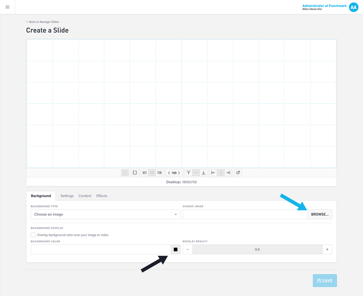 When you open up a new slide, generally the first thing you’ll want to do is add a background type. Most users use an image as the background type. By selecting the Browse button, you will launch the FileManager, which houses your local files as well as the Image Library, available to all Punchmark clients.