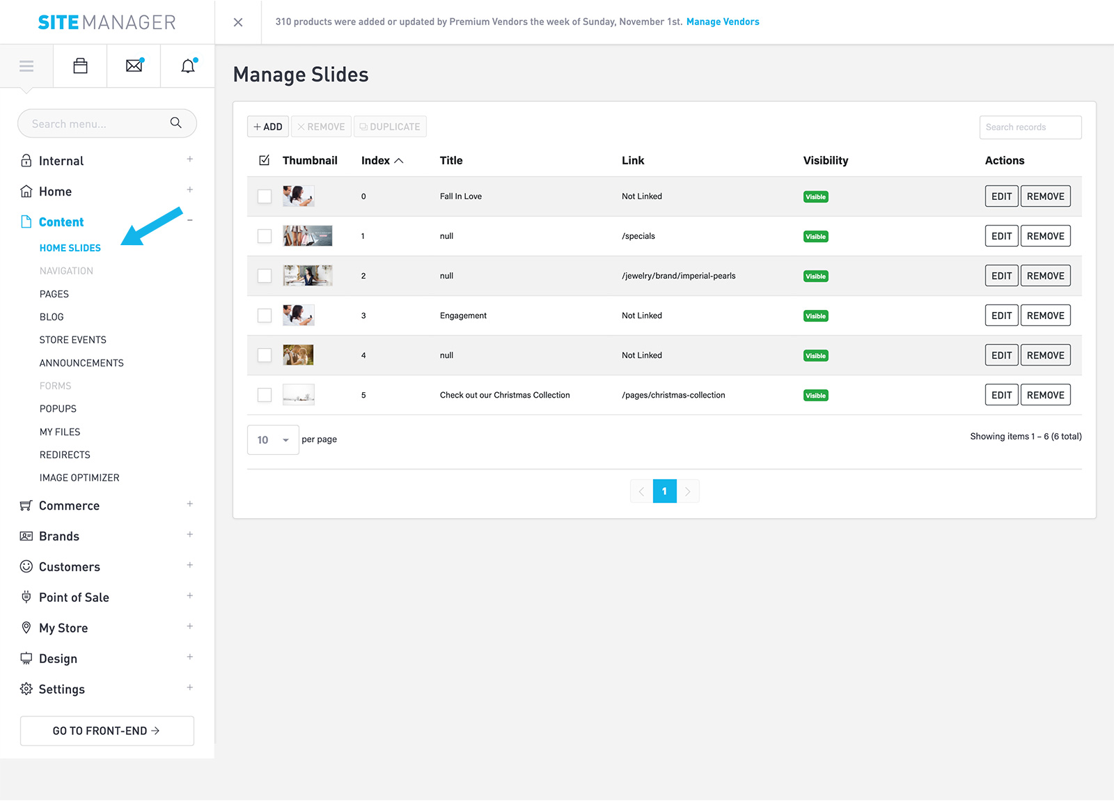 To begin, log into SiteManager and navigate to the sidebar > Content > Home Slides.
