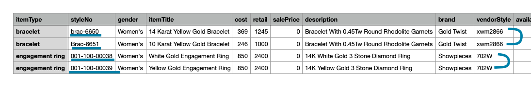 If youâre uploading multiple products with variations, ensure all connected products share a vendor style number for that set, and different sets share their own vendor style number. See below:
