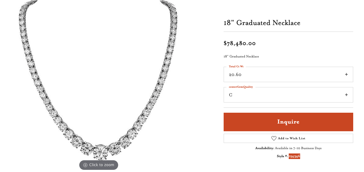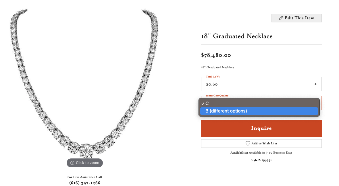 Please note, we only consider products to be a variation of one another if they are identical products with only one differing attribute. For example, a white gold diamond necklace with a total carat weight of 20.60ct and center gemstone quality of âCâ may have a variation of that same product with a gemstone quality of âBâ and same total carat weight of 20.60ct. But, if that necklace with the center gemstone quality of âBâ does NOT have a 20.60ct total carat weight option, we consider this a different product and will display to your customer as shown below:
