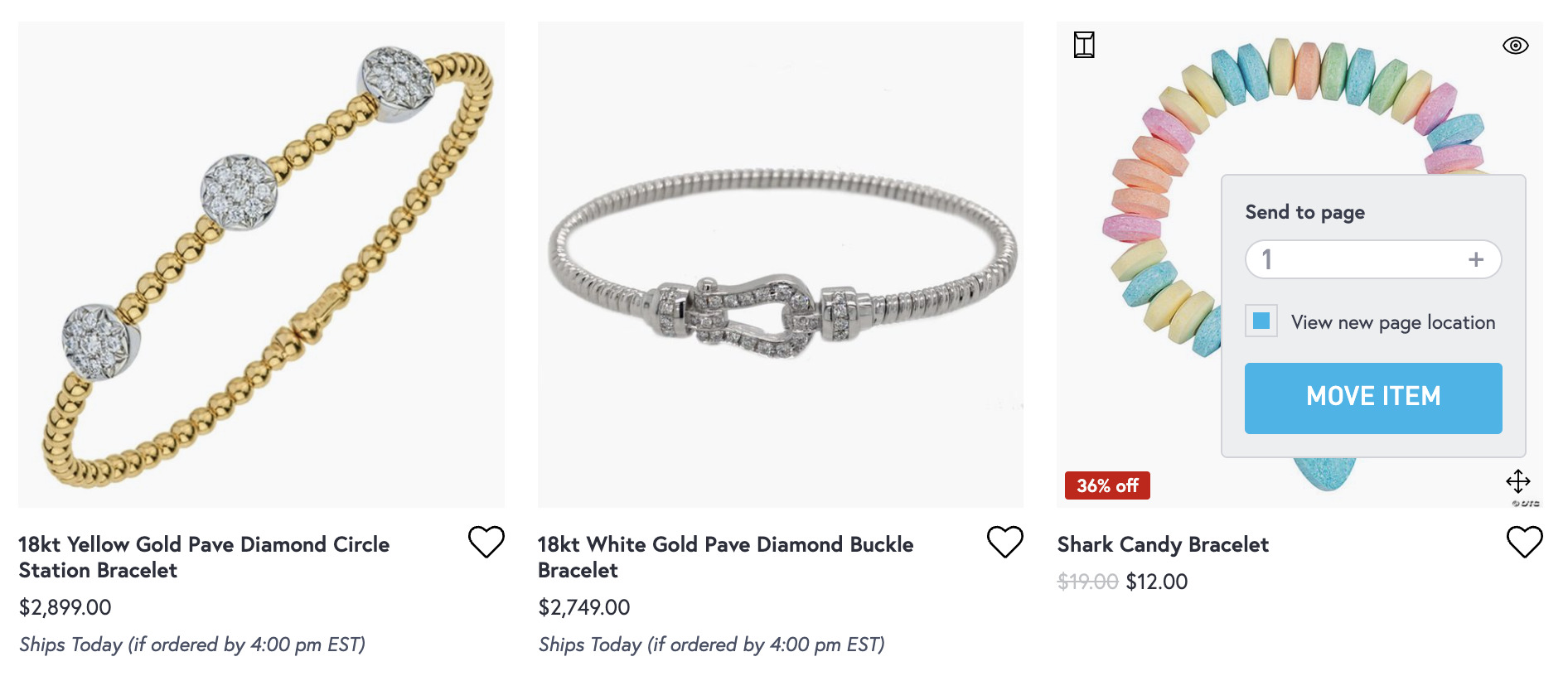 If you wish to move a product on a different page (ex: move a product from page 3 to page 1). You can select the gripping handles in the bottom right and then choose which page to send the product to. If you wish, you can also jump to the new page location as well to see the product and finalize the sort location.