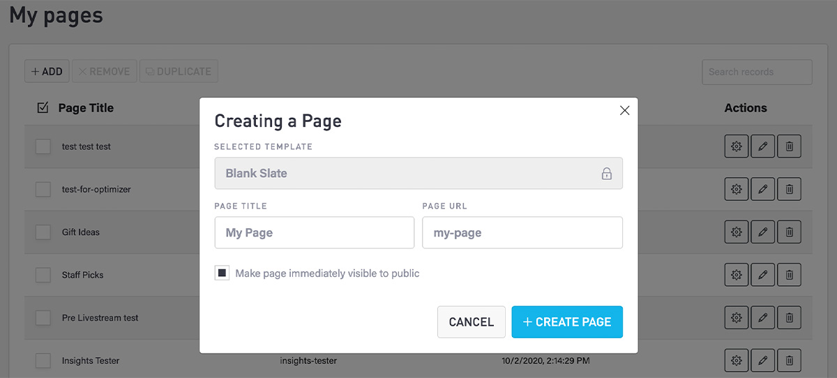 Choose what you'd like the page to be titled and click +CREATE PAGE