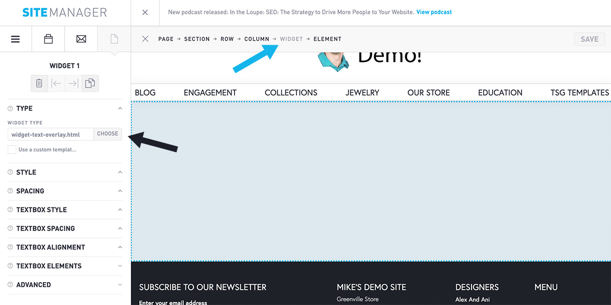 Under Widget Type, click on CHOOSE. In this menu, click on Wysiwyg Widget and click +CHOOSE.