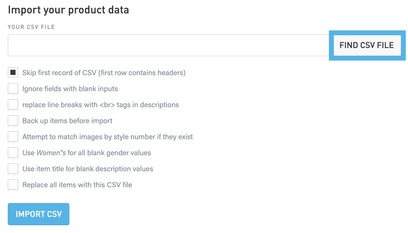 In the Import your product data section, check the boxes to enable the constraints you want to apply when you import the CSV file.