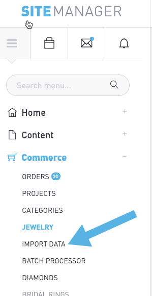 In the menu, select Commerce > Import button to view the Import Jewelry Products page.