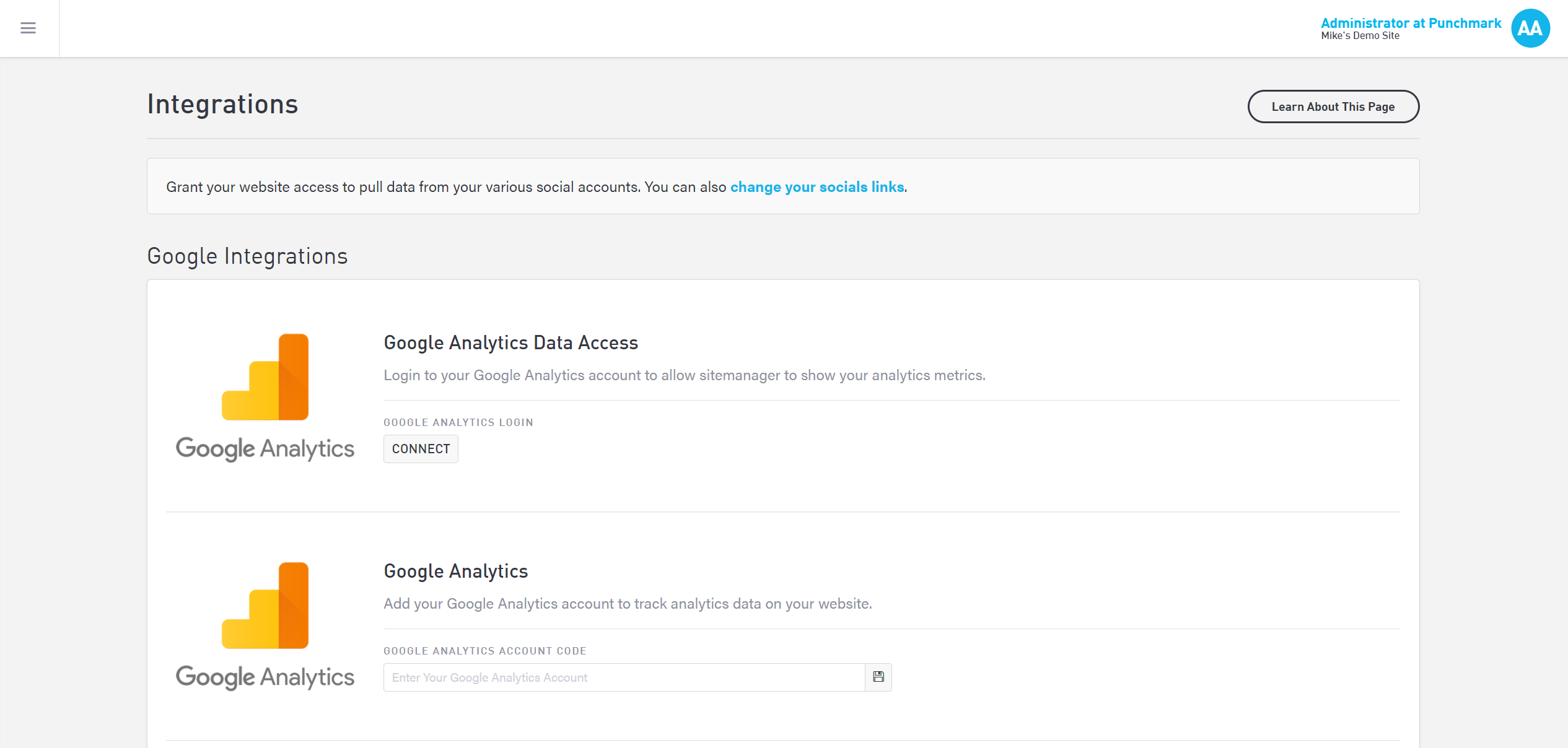 To enable Google Analytics, enter your Google Analytics Account Code and press the “Save” icon to the right of the text box. To allow Sitemanager to display your Google Analytics data, select “Connect” and follow the prompts provided.