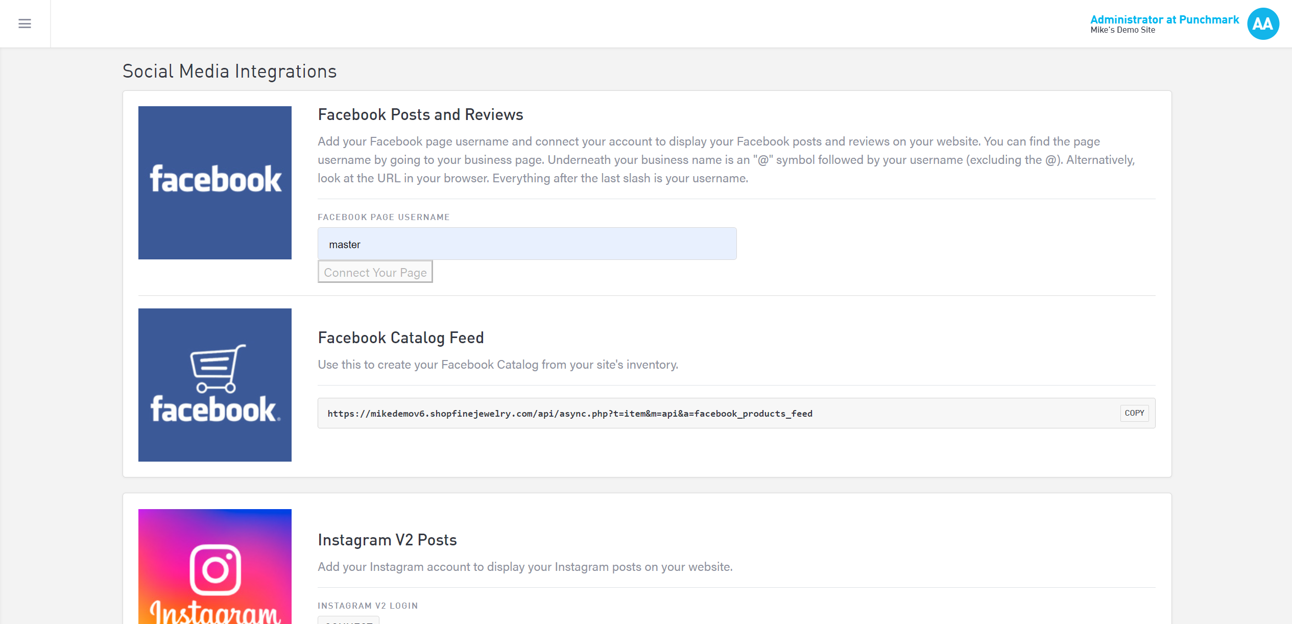 Facebook has two integrations: one covers posts and reviews, and the other is your Facebook Catalog Feed.