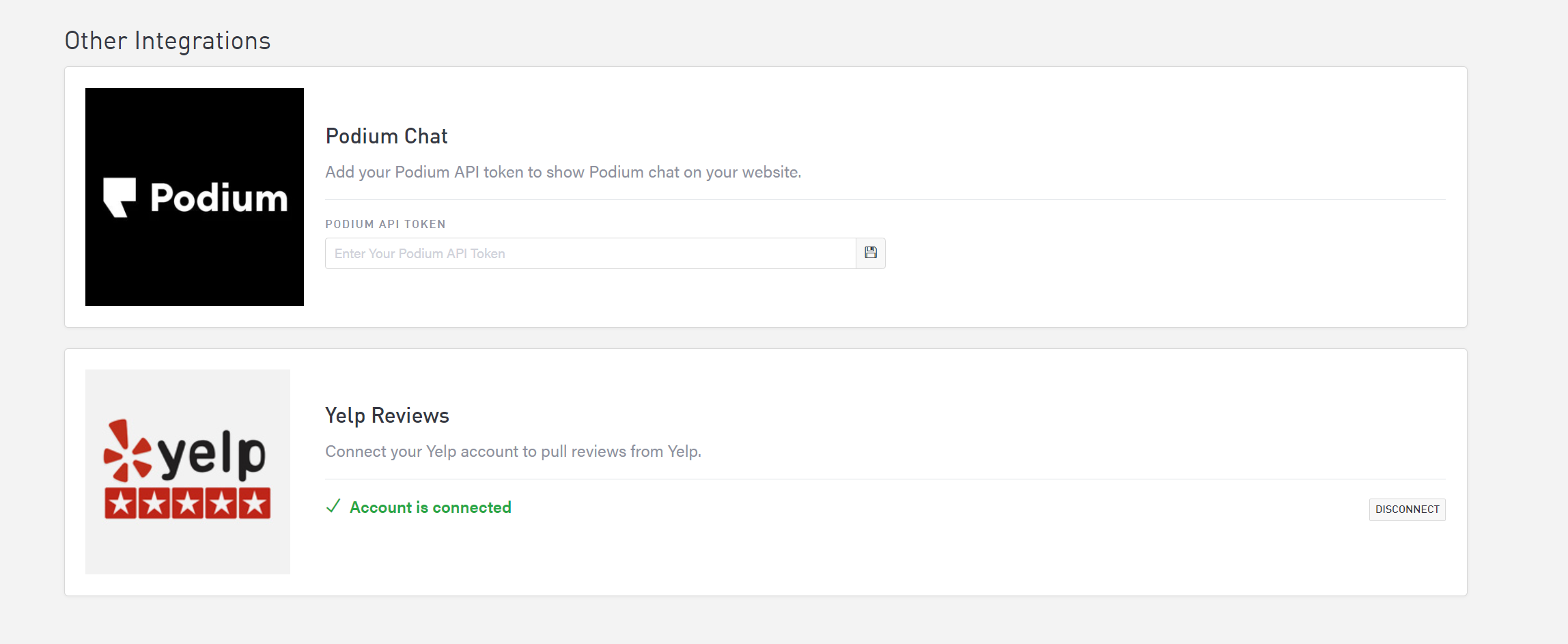 You can connect to Podium Chat, Yelp, and Clientbook using the Integrations page.