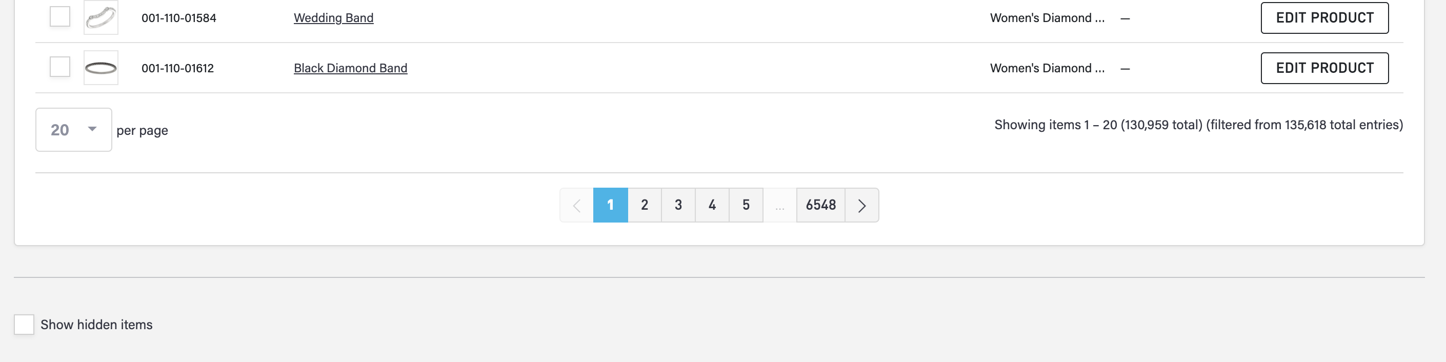 Scroll to the very bottom of the page table, and select “Show hidden items”. This will display your hidden products in the table.