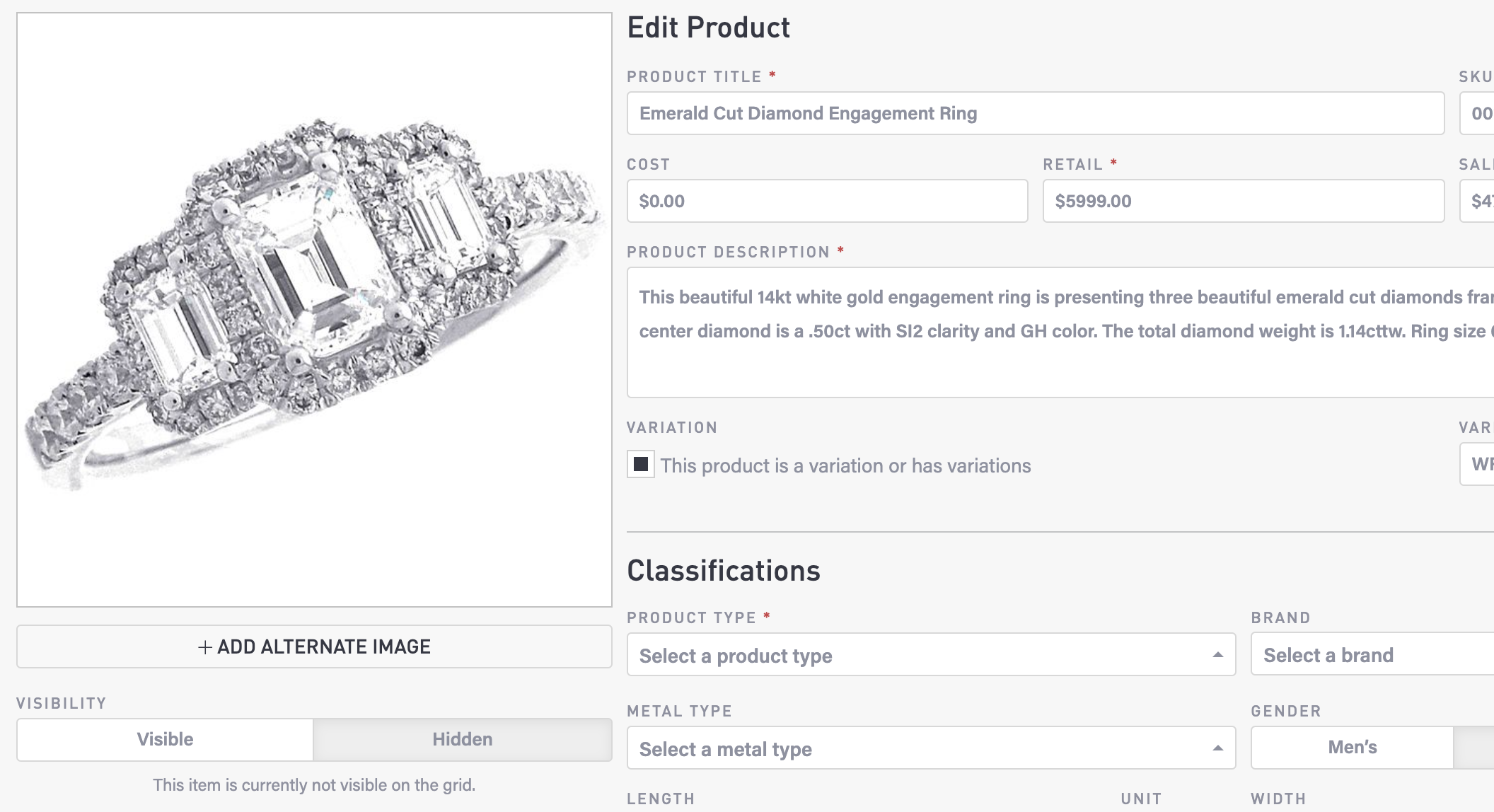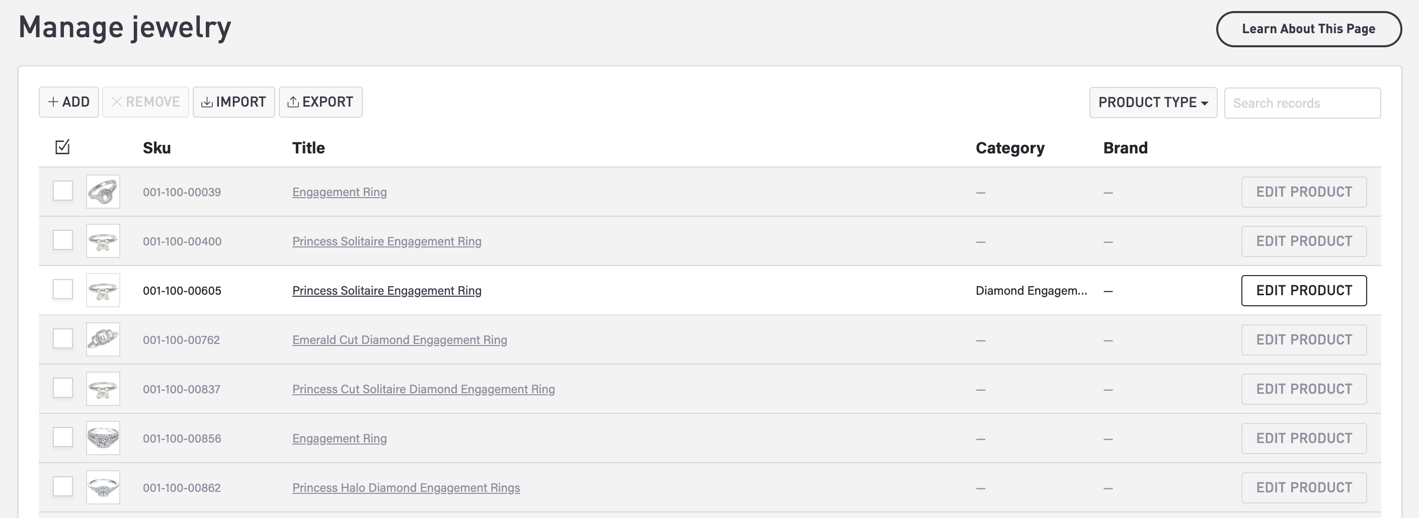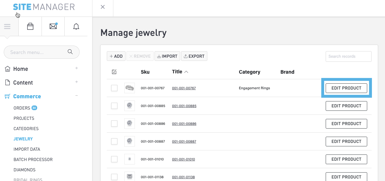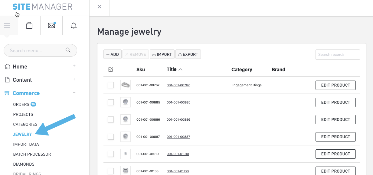 Manage your jewelry product list in the Commerce module. Select Commerce > Jewelry in the menu to view your list of jewelry products. Select a column heading to change the sorting of the list.