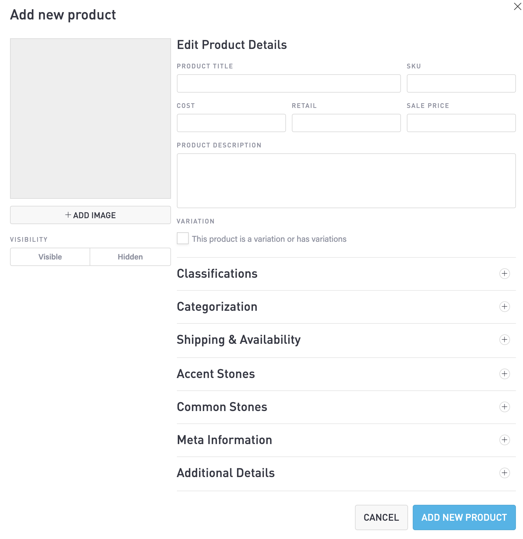 Enter product details such as the Title, SKU, Cost, Sale Price, and Description.