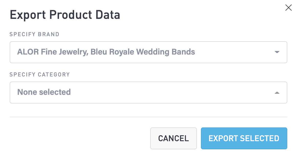Select the Export button at the top of the page. After a few moments, a popup window will appear in which you can choose the specific Brands and/or Categories of products that you want to export. In the drop-down lists, you can select to check multiple items. Select the Exported Selected button to export your selected product records to a CSV file.