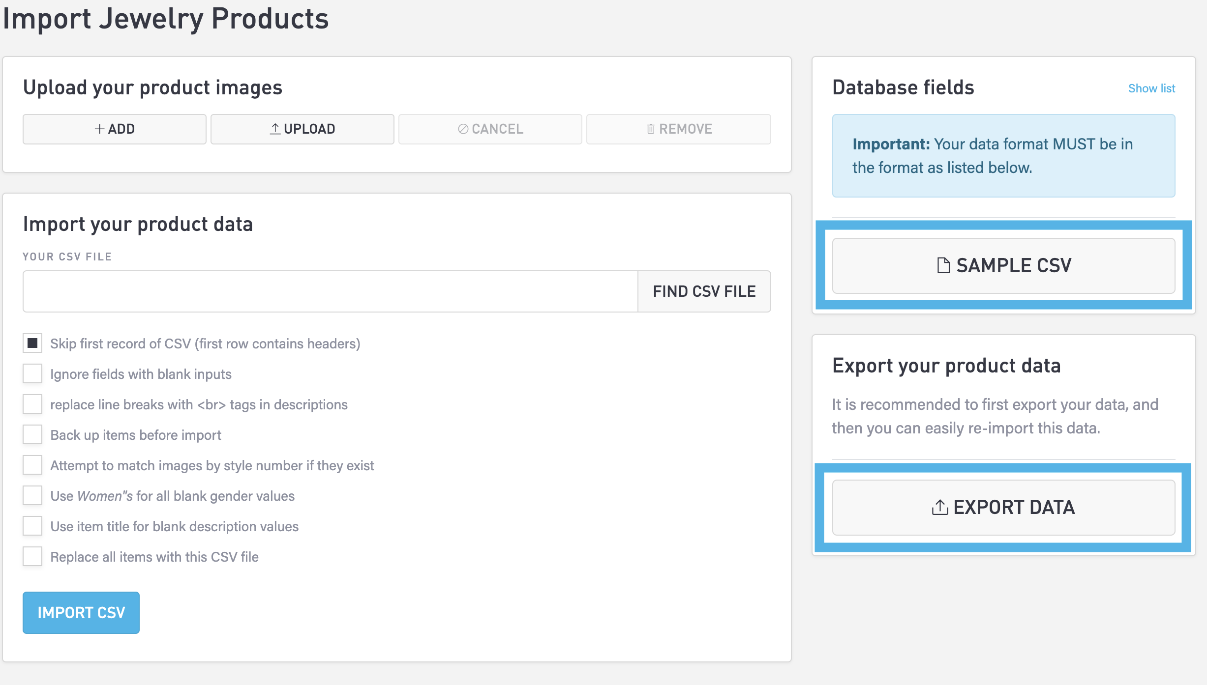 The Import Jewelry Products page will appear. Continue reading below to download a sample CSV, export your product data to a CSV, and import the edited product data CSV file.