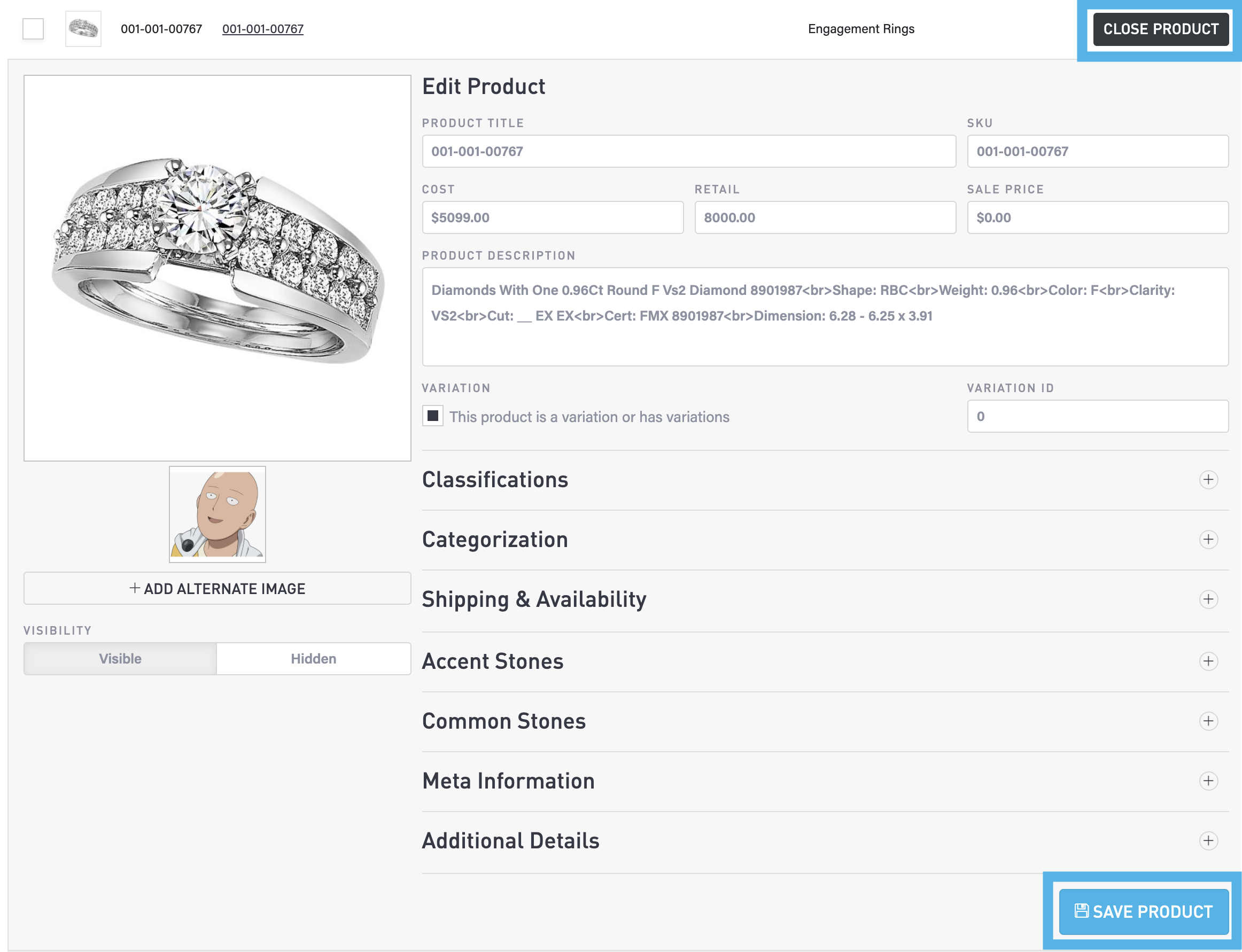 Select the Save Product button to commit your changes to this product. Select the Close Product button to close the drop-down panel.