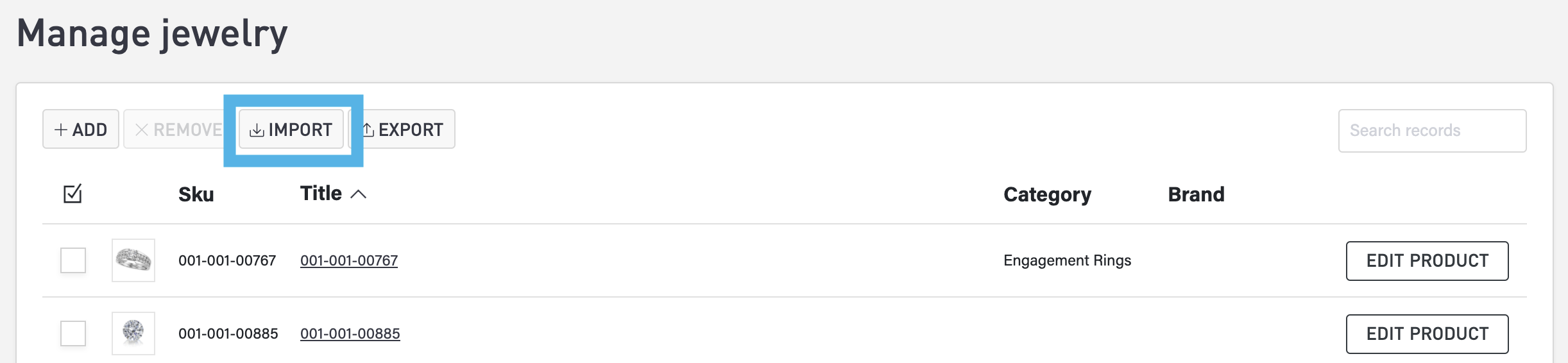 Being by selecting the Import button to view the Import Jewelry Products page.