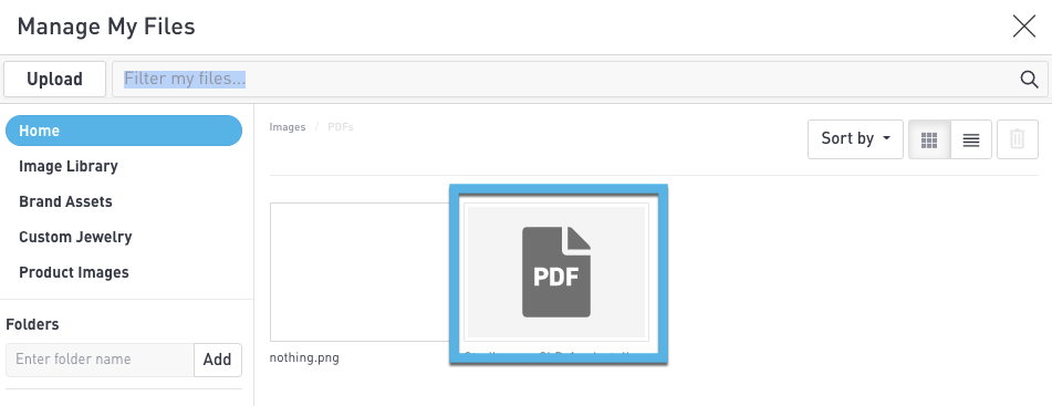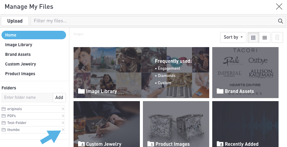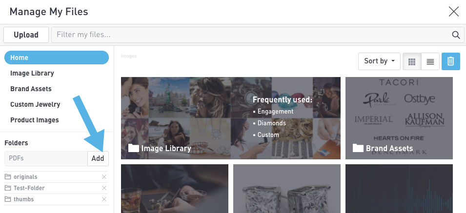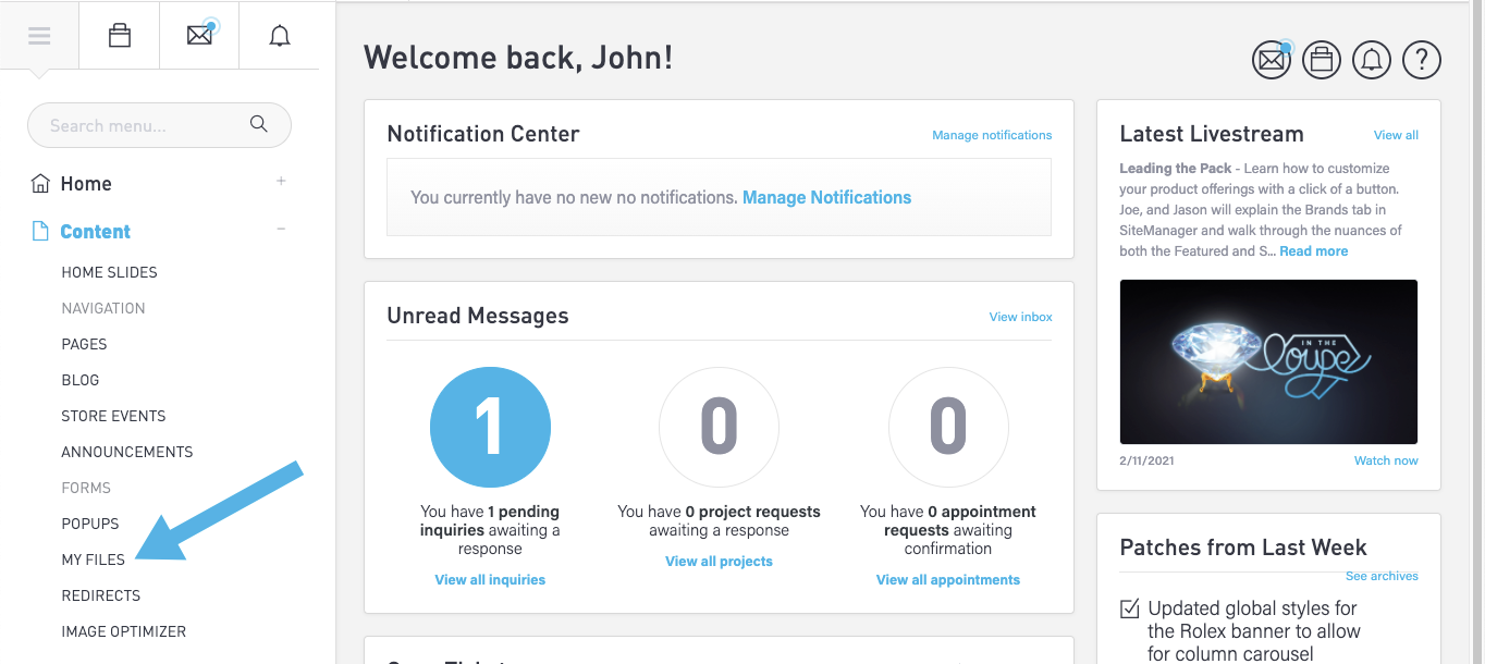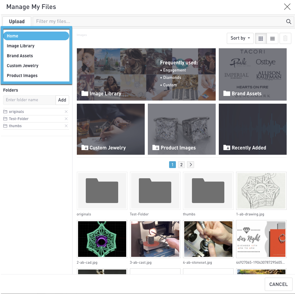 In the main menu, select Content > My Files to display a popup in which you can upload and view files, and also create and delete folders. These files are available in other features, such as editing pages or jewelry items.