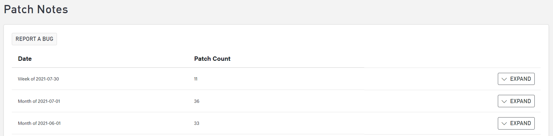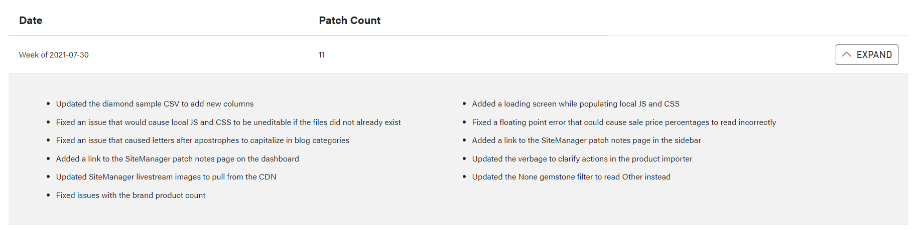 To see the most recent patch notes, navigate to the Patch Notes page under the Home section of SiteManager. Each release of patch notes is labeled by date. Notes may be released weekly or monthly depending on the quantity of features requested. Within each release of new patch notes, you can see how many updates were made under the “Patch Count” column.