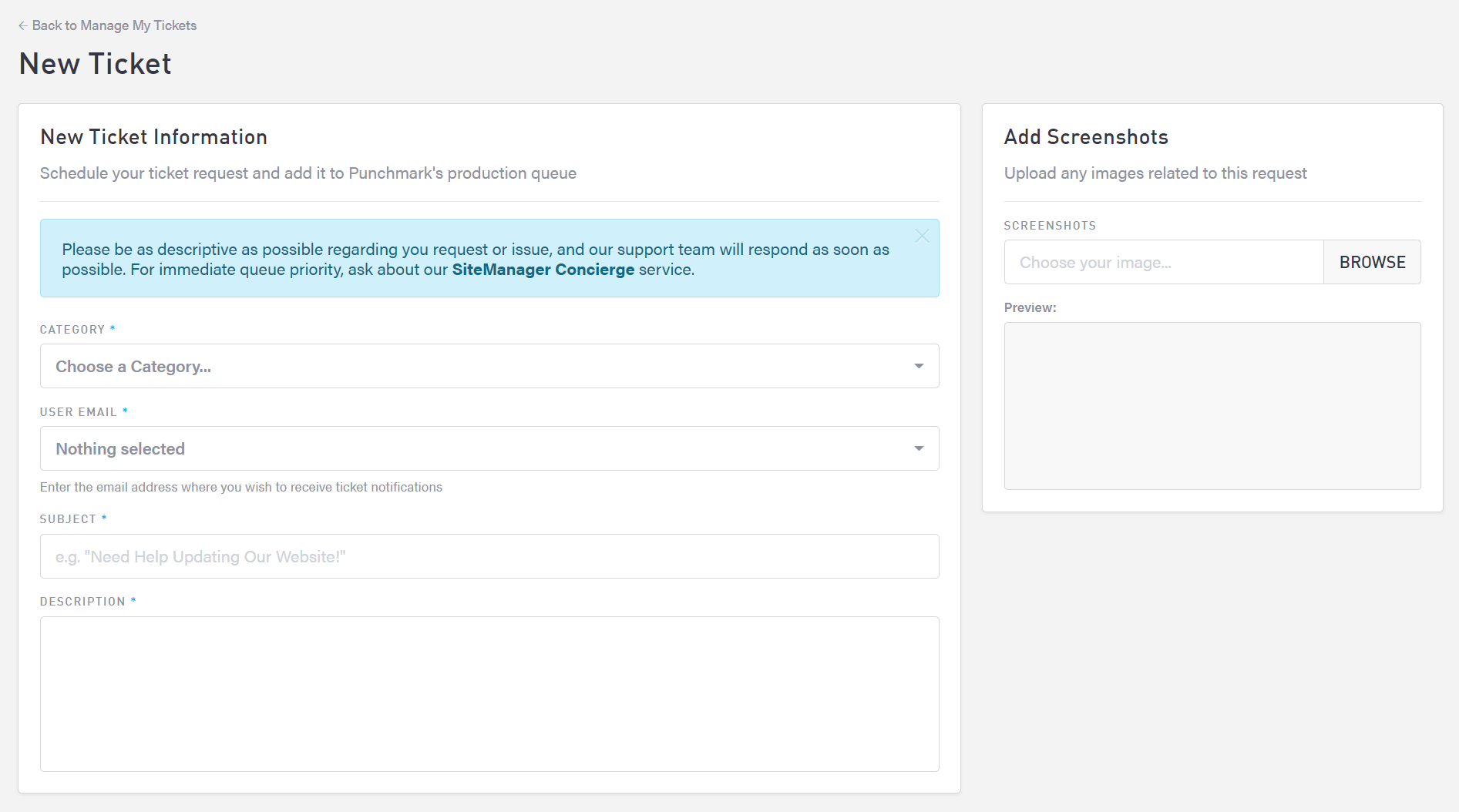 Select the category that best describes your bug, the email address of the person we should contact regarding follow-ups to the ticket, a subject, and detailed description of the error you are encountering. Use the right sidebar to upload any screenshots of your error where applicable. For example, if you are receiving an error message, it may be easier to screenshot it rather than typing it out.