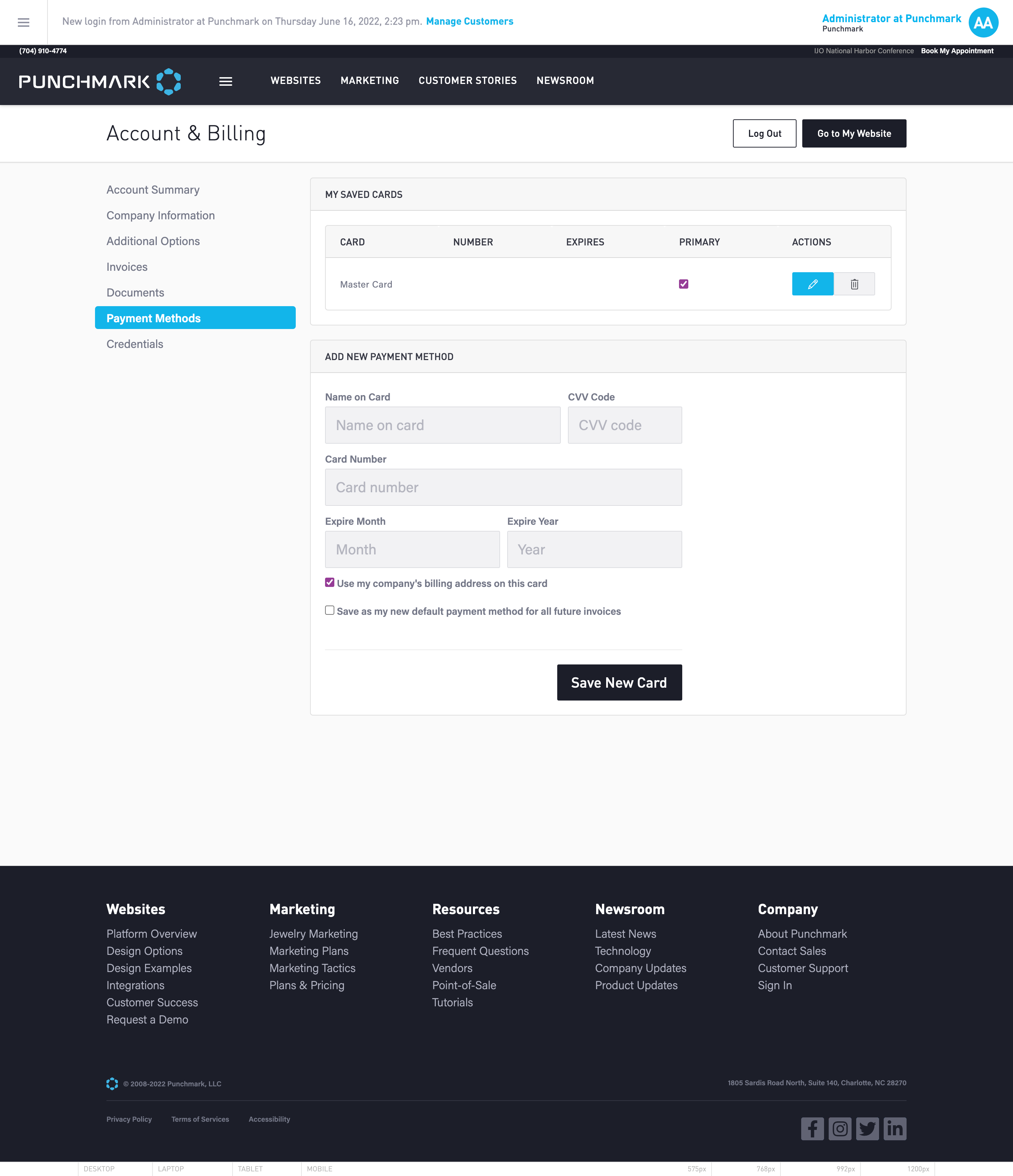 In the Payment Methods page you are able to add new payment methods, edit or delete saved cards, switch which saved card is set as the primary payment method.