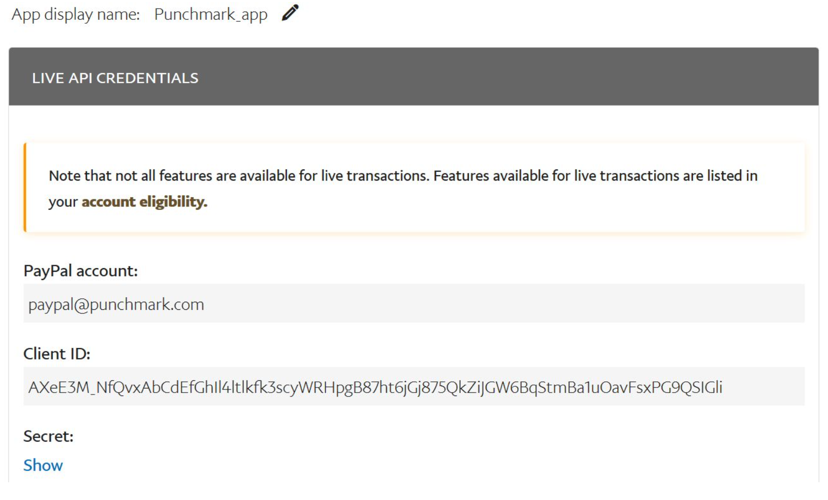 5. Email your Client ID and your Secret (click "Show" to see the secret) to customerservice@punchmark.com. Be sure to copy and paste the entire text for each credential.