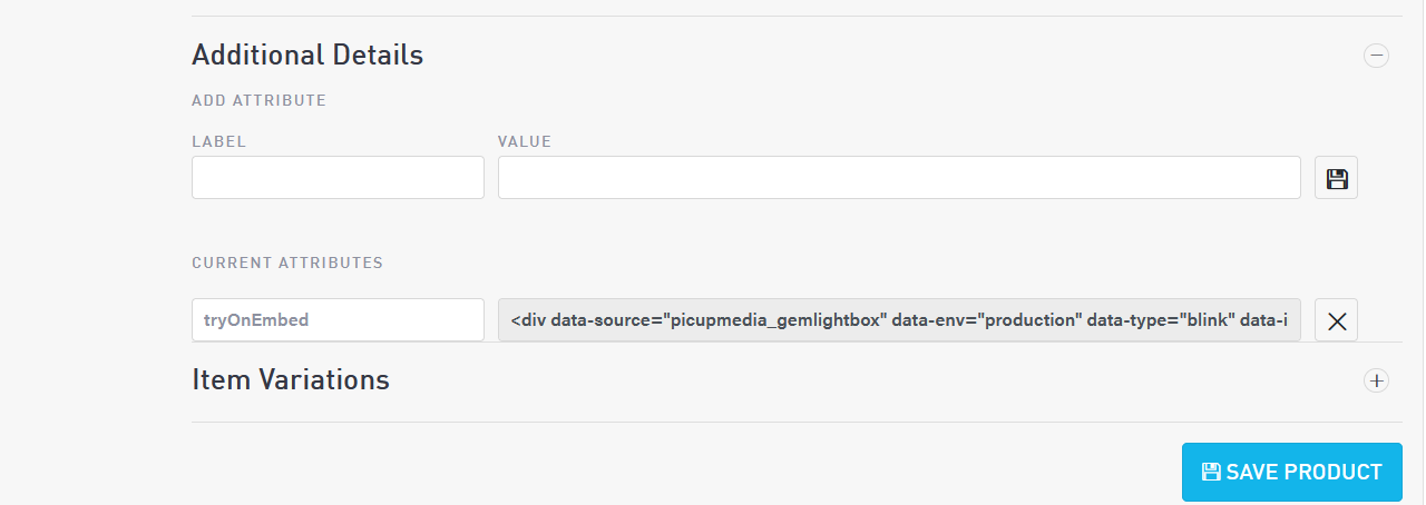 Add the full HTML to the “value” box corresponding to tryOnEmbed then save the product using the blue Save Product button