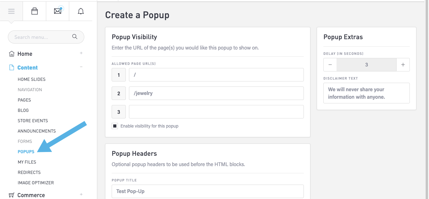 In the main menu, click Content > Popups to view the Create a Popup page. Here, you can create a popup window message that will appear on up to three pages that you specify. On each of the pages, the same message will appear in the popup.