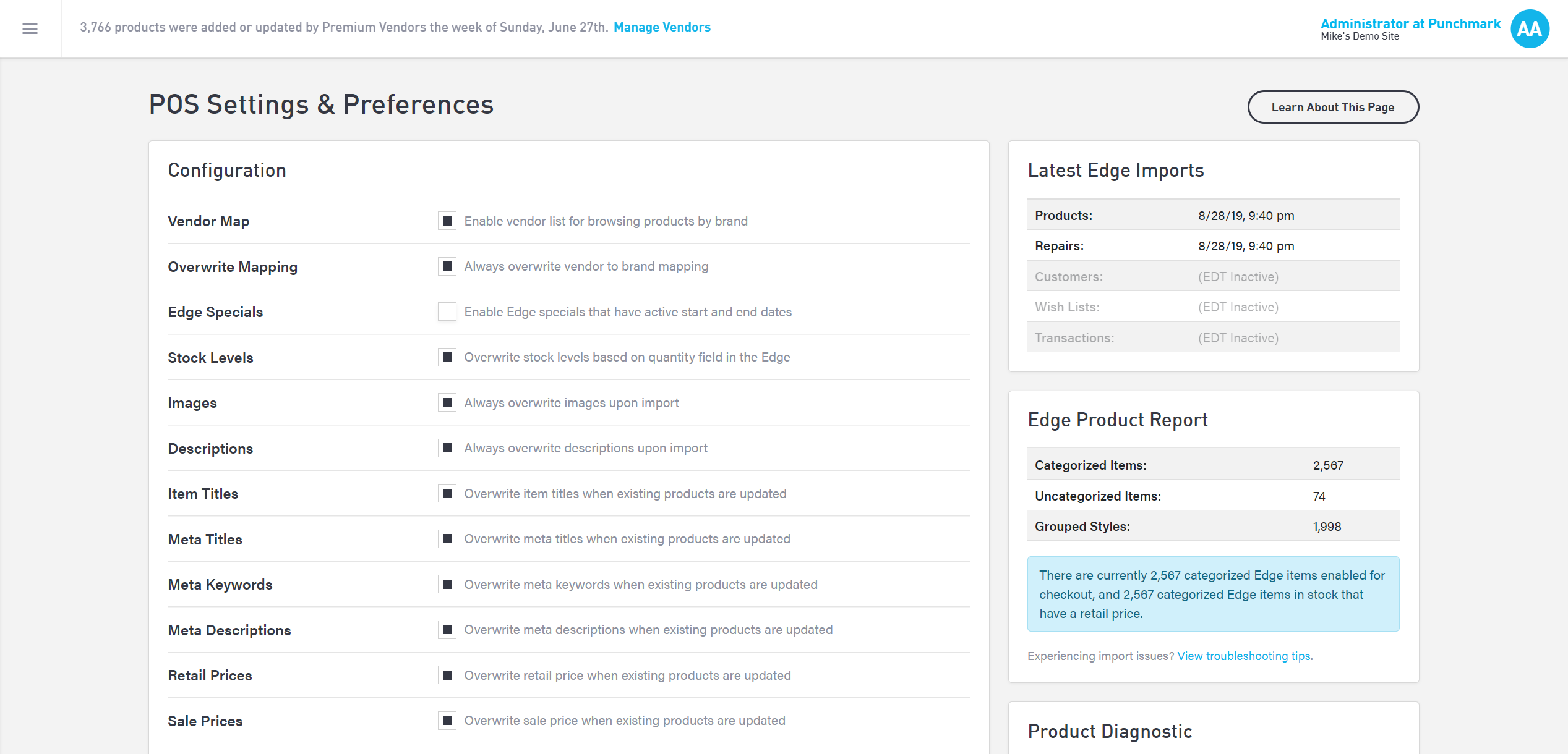 Use the Preferences page to set how you would like to configure your POS settings. The Edge is Punchmark’s only POS integration currently, so all settings listed refer to The Edge.