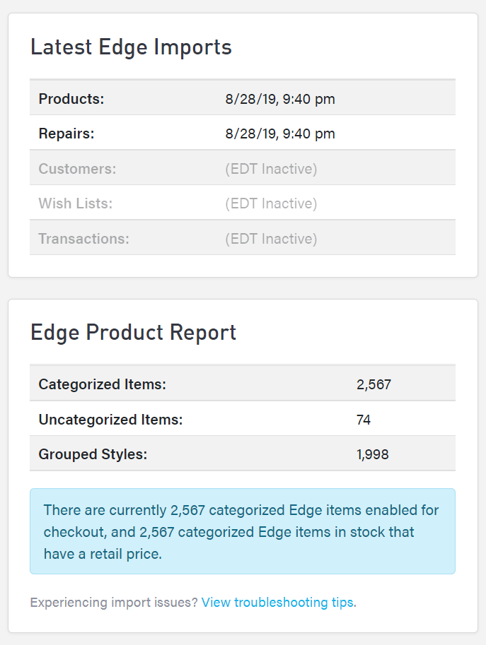 You can see your most recent Edge data from the sidebar column on the right side. View both the latest imports and the product report to see the last time your data was pulled and how many products are in your system.