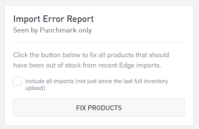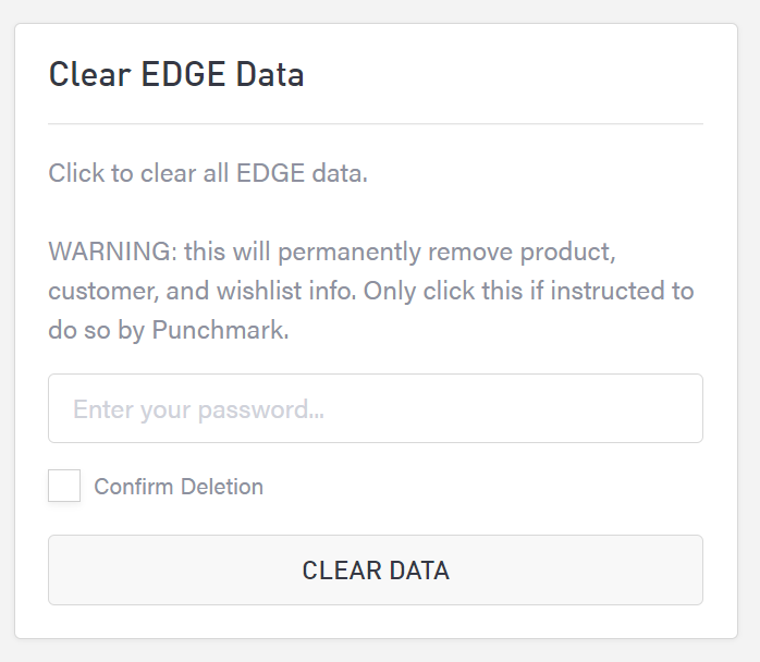 If you wish to reset your website and clear all Edge data from your site, including product, customer, and wishlist info, you can clear Edge data using this section. You should only do this if instructed to do so by Punchmark, as it will require re-importing all products, customer, and wishlist info from The Edge.