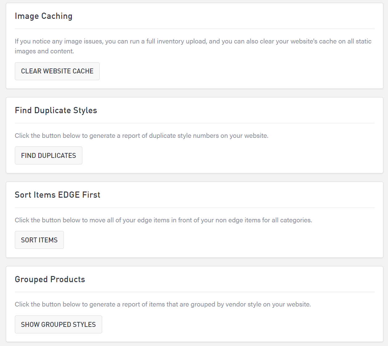 There are 4 item settings you can use to troubleshoot and generate reports for products. For each, simply select the associated button to perform the action. Reports will auto-download. Depending on how many items are on your site, the reports may take several minutes to generate. Do not navigate away from the page while the reports are generating.