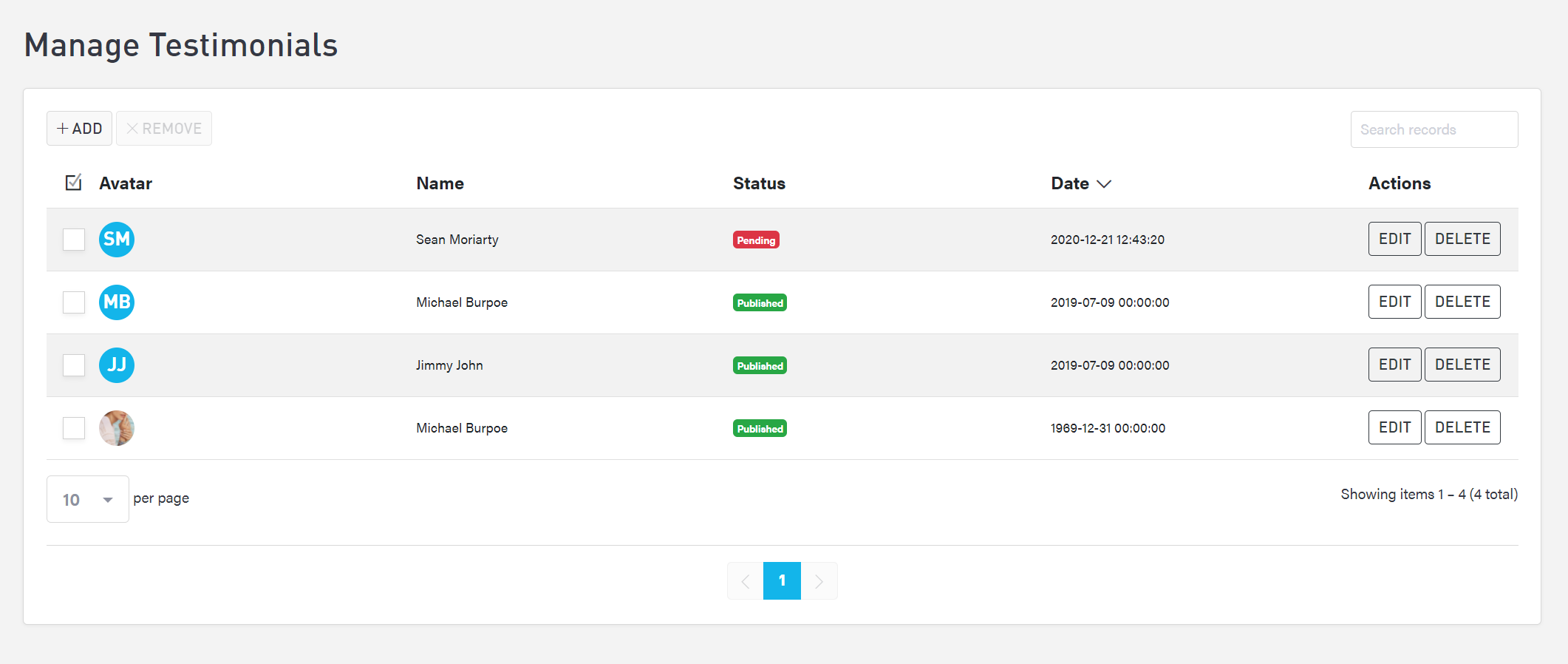 To delete a single testimonial, select “Delete” to the right of the testimonial you wish to remove (under the Actions column). To remove multiple testimonials, select the checkboxes of those you wish to remove, and then select “Remove” at the top of the page.