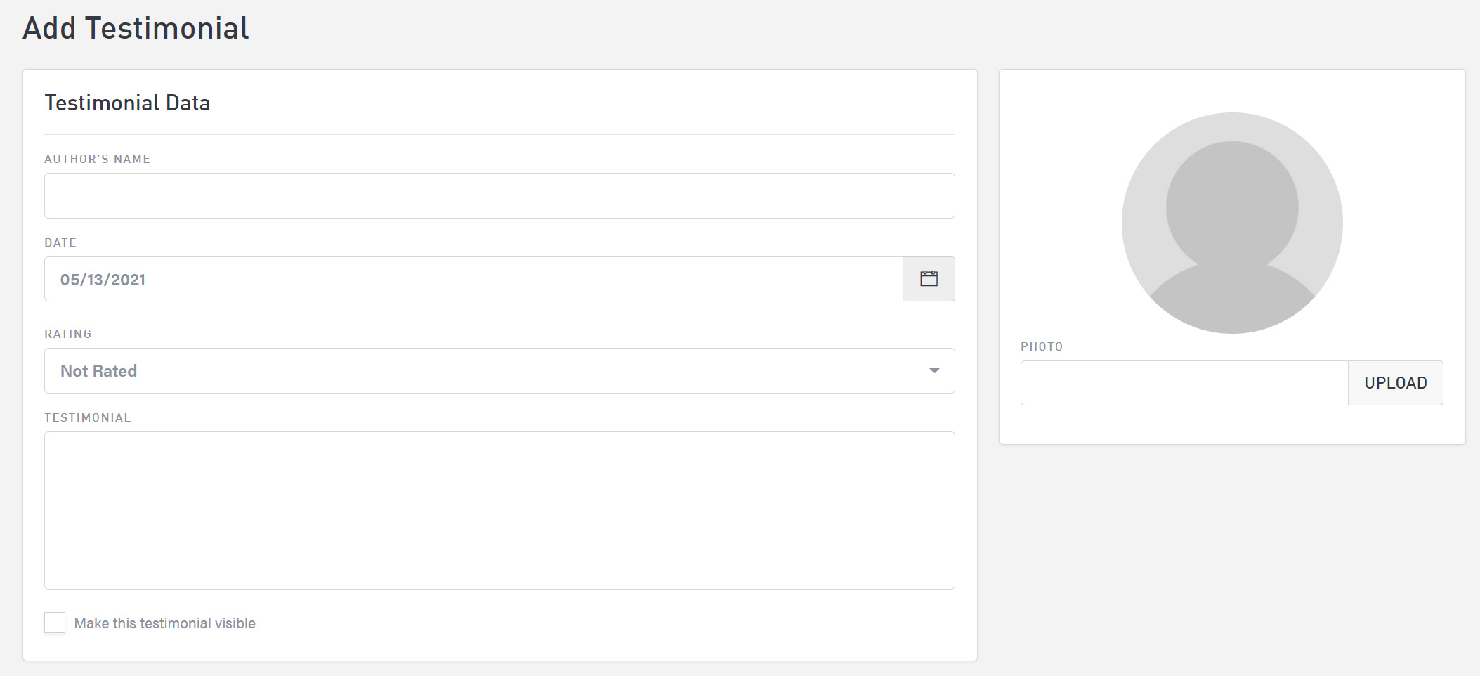 To add a new testimonial, select the “Add” button at the top of your list of testimonials. You will be taken to a new page. Fill out the author’s name, testimonial date, rating, and and comments or experience. You can also upload a photo directly from your computer or tablet’s files (unlike most uploads, this is not hooked up to FileManager).