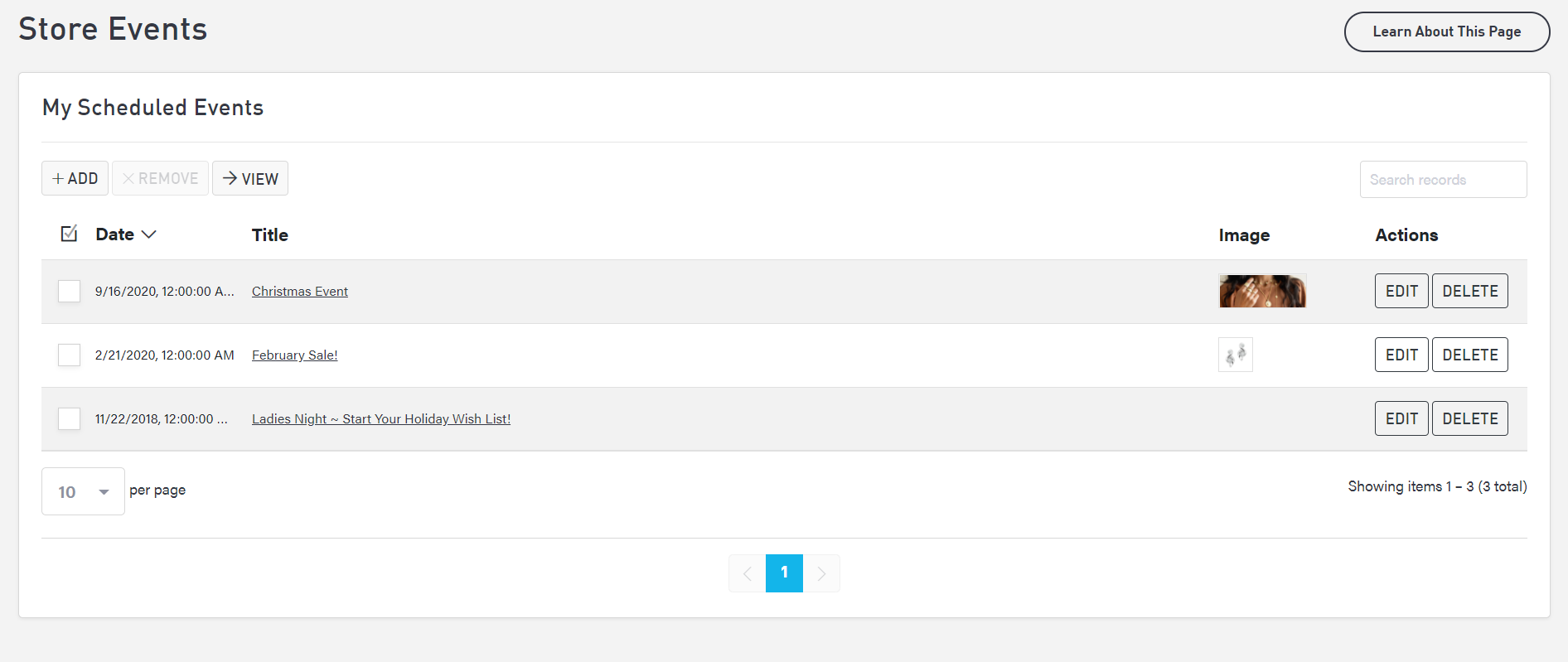 The Store Events page allows you to put events on your website with discrete timeframes, special images, and event information. To access the Store Event editor, in the main menu, select Content > Store Events. You will see a block titled “My Scheduled Events.”