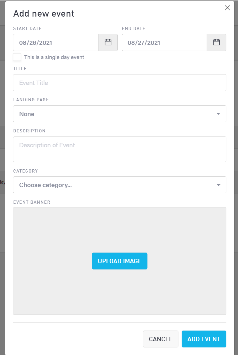 To add a new event, select the “Add” button in the left-hand corner of the page. A pop-up will appear prompting you to add your event information.